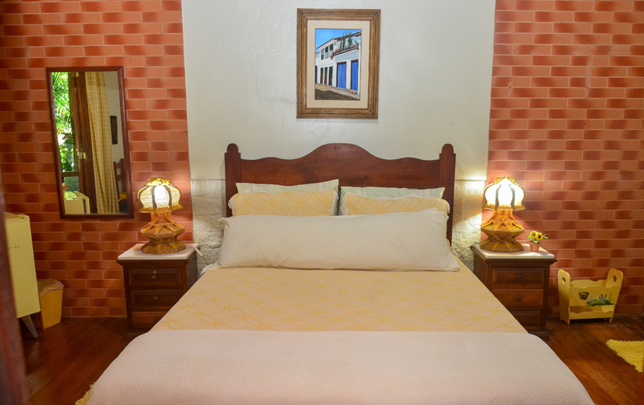 A Suíte Amarela conta com: cama de casal, 1 cama de solteiro (hóspede acima de 15 anos), ar condicionado Split, ventilador de teto, Smart TV 32”, frigobar estilo retrô, louças e talheres, mesa, interfone, varanda com sofá e rede. Banheiro com box Blindex.